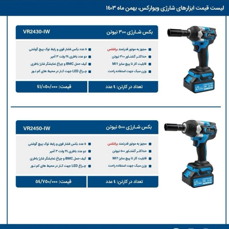 ویژگی های کلیدی آچار بکس شارژی ویوارکس VR2450IW این آچار بکس با ویژگی های منحصربه فرد خود، یک انتخاب ایده آل برای متخصصان، صنعتگران و تکنسین هایی است که به ابزاری قدرتمند، قابل اعتماد و با کاربری آسان نیاز دارند. این ویژگی ها عبارتند از: موتور براشلس قدرتمند: موتور براشلس این آچار بکس، با ارائه راندمان بالا، طول عمر بیشتر و استهلاک کمتر، عملکردی بی نظیر را تضمین می کند. این موتورها با تولید گشتاور بالا، امکان باز و بسته کردن پیچ و مهره ها را در سخت ترین شرایط فراهم می کنند. حداکثر گشتاور 500 نیوتن متر: این آچار بکس با حداکثر گشتاور 500 نیوتن متر، قادر است پیچ و مهره هایی با سایز M16 و بالاتر را به راحتی باز و بسته کند. باتری های 24 ولت با ظرفیت 3 آمپر ساعت: استفاده از دو عدد باتری 24 ولت با ظرفیت 3 آمپر ساعت، امکان استفاده طولانی مدت از دستگاه را بدون نیاز به شارژ مکرر فراهم می کند. طراحی سبک و ارگونومیک: طراحی سبک و ارگونومیک این آچار بکس، استفاده از آن را برای مدت طولانی آسان کرده و از خستگی کاربر جلوگیری می کند. چراغ LED: وجود چراغ LED در قسمت جلویی دستگاه، امکان کار در محیط های کم نور و تاریک را فراهم می کند. نشانگر شارژ باتری: نشانگر شارژ باتری، میزان شارژ باقی مانده را به کاربر نمایش می دهد و از خاموش شدن ناگهانی دستگاه جلوگیری می کند. دیمردار: قابلیت تنظیم سرعت (دیمردار)